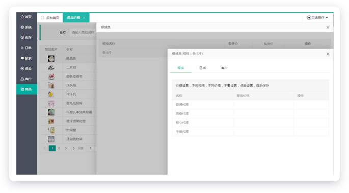 訂單人員、庫管人員、財務(wù)人員,系統(tǒng)權(quán)限都不同,業(yè)務(wù)人員管轄的客戶也相互獨(dú)立;不同層級客戶可以設(shè)置等級價,不同客戶區(qū)域也可設(shè)置區(qū)域價,也可以單獨(dú)為某個客戶設(shè)置價格,同種商品,不同規(guī)格價格也可不同!